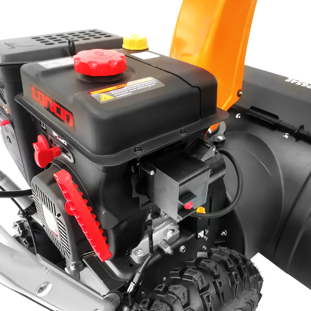 На снегоуборщик 7654E установлен четырехтактный бензиновый двигатель с воздушным охлаждением LONCIN G250FDS мощностью 7,1 л.с. Двигатель разработан специально для эксплуатации при низких температурах. Защищен от промерзания, обледенения и попадания снежной пыли. Характеризуется легким запуском, экономичным потреблением топлива, низким уровнем шума и вибраций. Рекомендуемое топливо - бензин не ниже Аи-92. Не допускается использовать топливо низкого качества! Из-за этого могут выйти из строя детали двигателя.
