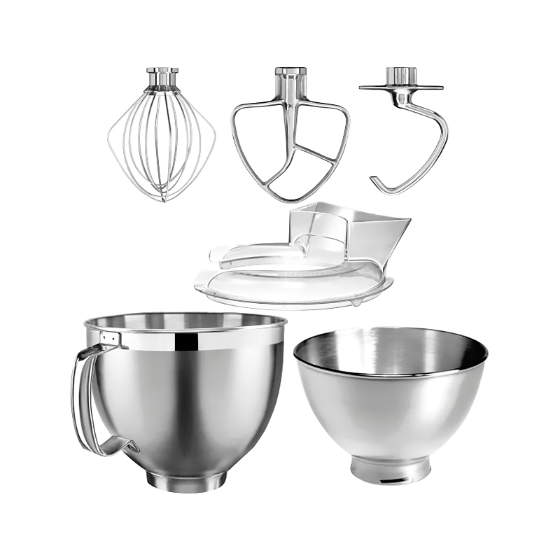 венчик для взбивания, дополнительная чаша, насадка крюк для замешивания теста, лопатка для смешивания, защитный обод от брызг |