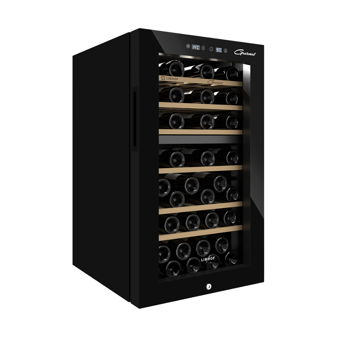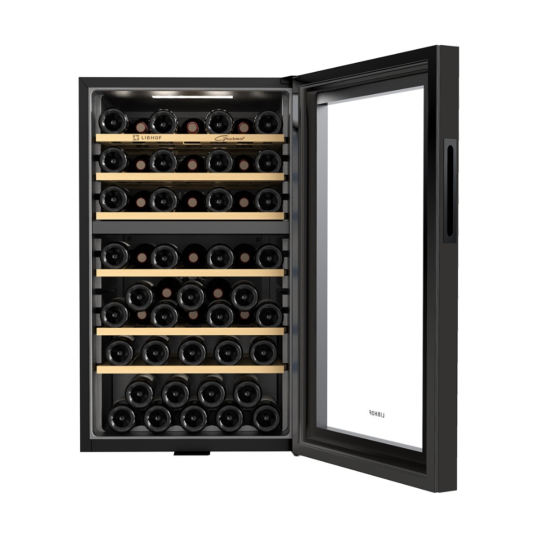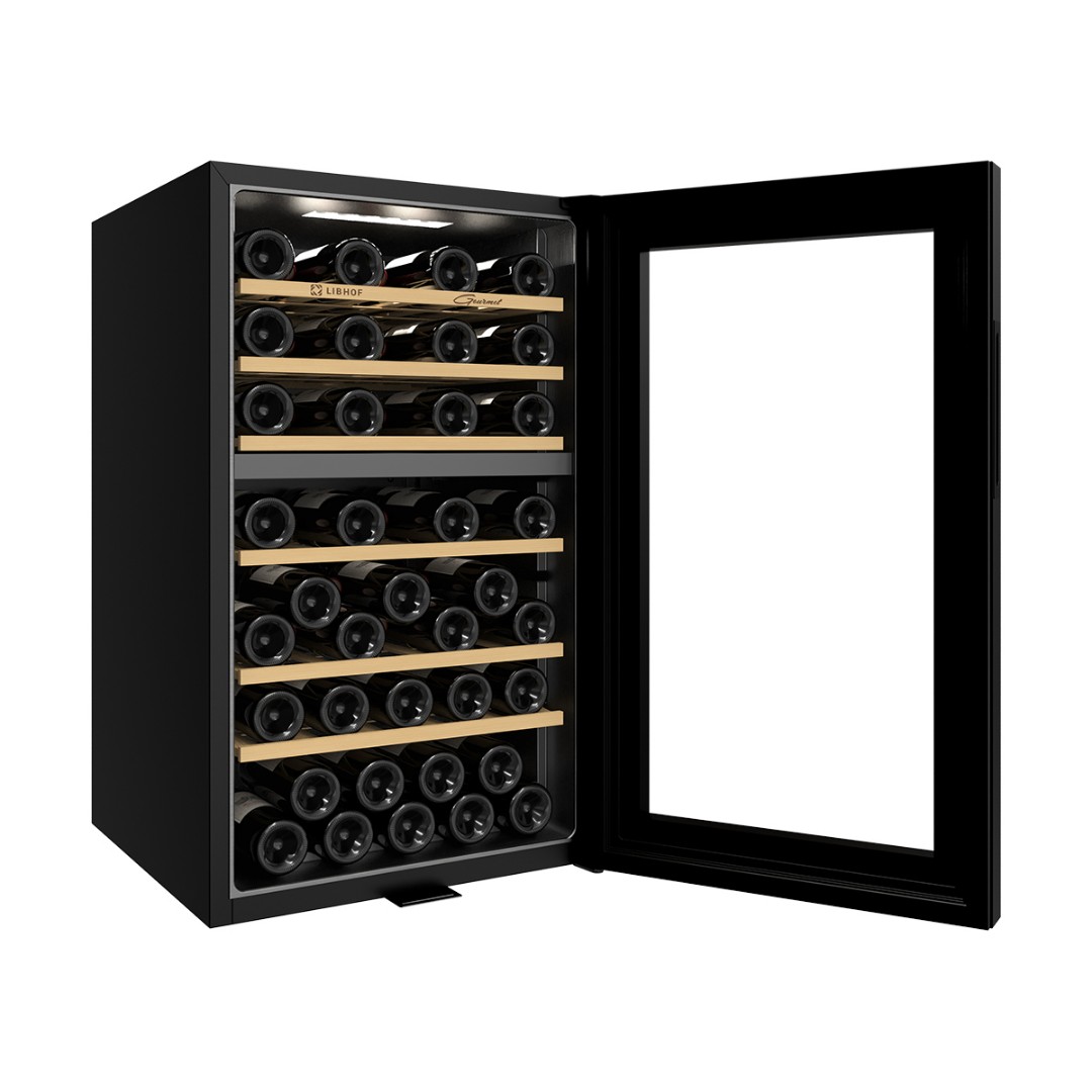 Мультитемпературный винный шкаф Libhof GMD-54 имеет две зоны охлаждения и позволяет регулировать температуру в одной зоне в диапазоне от 5 до 12 °C, во второй зоне от 12 до 20 °C,что делает его подходящим для хранения различных видов вин. Винный холодильник вмещает 54 бутылки типа бордо и имеет 6 съёмных полок из массива дерева. Отдельностоящий винный шкаф, оснащён современной компрессорной системой, которая значительно снижает уровень вибрации и шума, предотвращая взбалтывание вина и появление осадка.