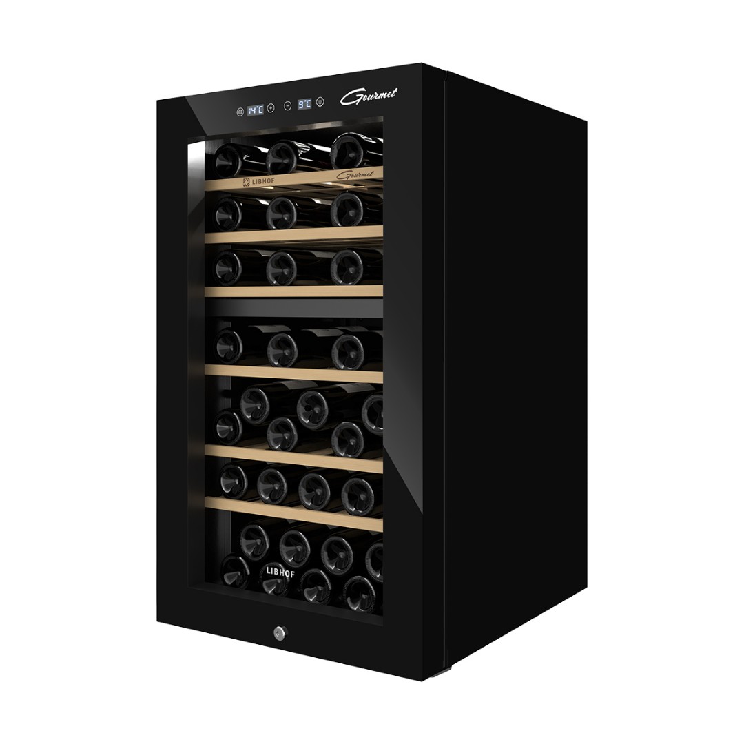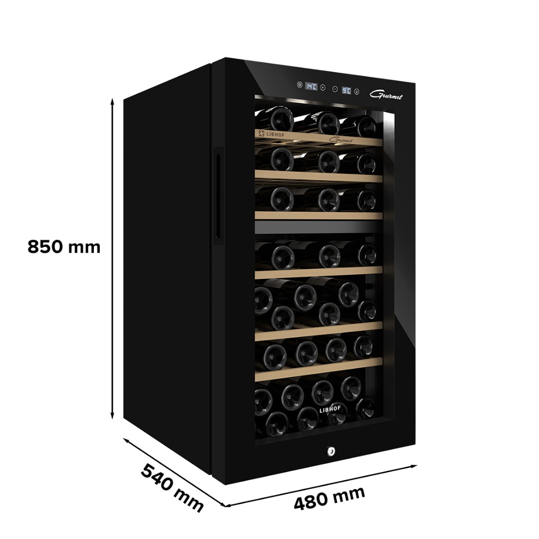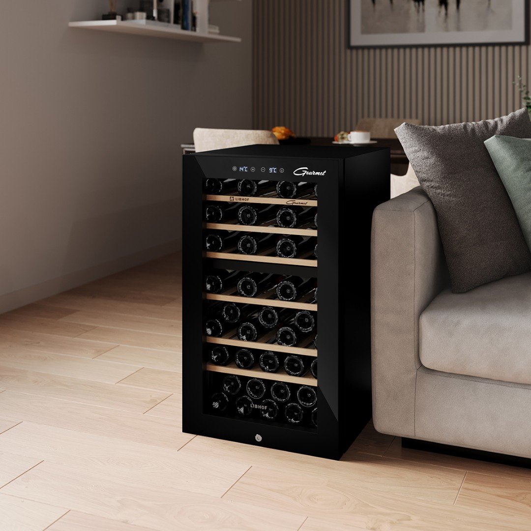 Мультитемпературный винный шкаф Libhof GMD-54 имеет две зоны охлаждения и позволяет регулировать температуру в одной зоне в диапазоне от 5 до 12 °C, во второй зоне от 12 до 20 °C,что делает его подходящим для хранения различных видов вин. Винный холодильник вмещает 54 бутылки типа бордо и имеет 6 съёмных полок из массива дерева. Отдельностоящий винный шкаф, оснащён современной компрессорной системой, которая значительно снижает уровень вибрации и шума, предотвращая взбалтывание вина и появление осадка.
