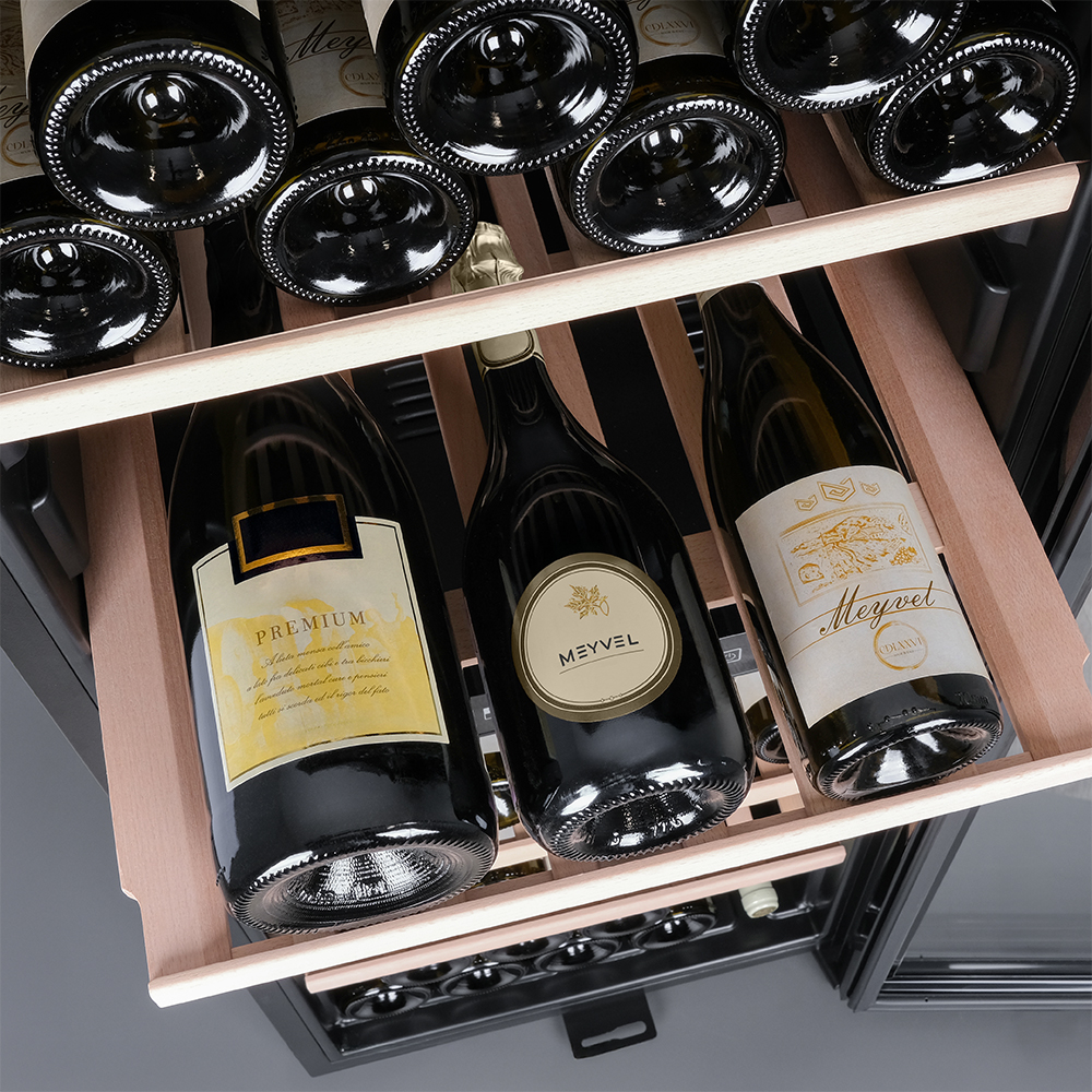 Meyvel MV98-KBF2 оборудован двумя температурными зонами, чтобы эффективно хранить различные сорта вин. В верхней зоне температура регулируется в диапазоне от +5 до +12°C, которая идеальна для белых вин и шампанского. Нижняя зона предлагает температурный режим от +12 до +20°C, подходящих для красных вин. Это обеспечивает индивидуальный подход к каждому виду вина. Благодаря большому расстоянию между полками в шкаф помещаются не только бутылки 0,75 л типа «Бордо», но и большего объема. Бутылки также можно установить стоя.