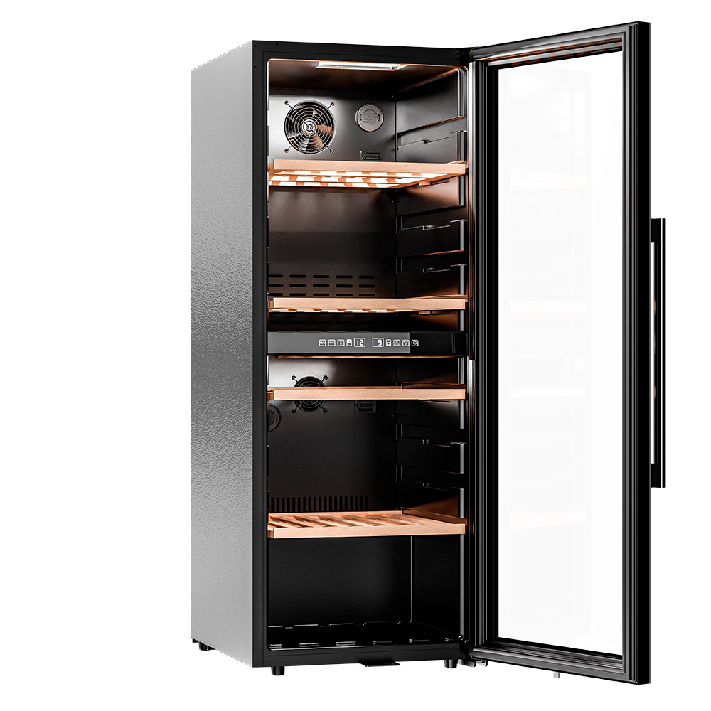 Модель оснащена четырьмя полками из дерева, что не только выглядит стильно, но и способствует правильной циркуляции воздуха внутри шкафа. Дополнительно можно установить до 5 полок, а также приобрести демонстрационную полку и полку для фужеров. Двойное стекло с УФ-фильтром надежно защищает вино от вредного воздействия света, что сохраняет его уникальный вкус и аромат.