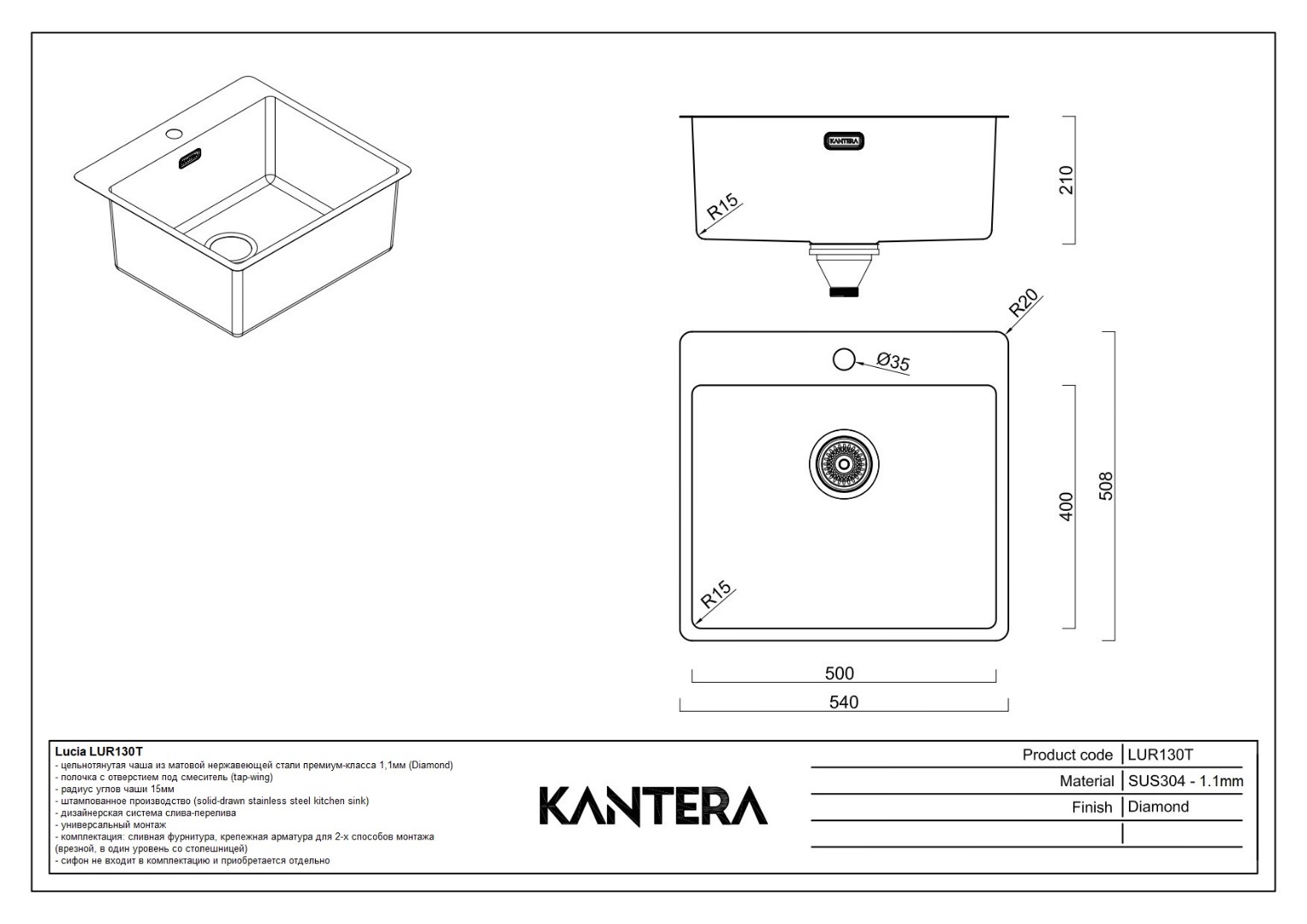 матовая сталь (Diamond) 1,1 мм, цельнотянутая чаша, штампованное производство, отверстие под смеситель, дизайнерская система слива-перелива