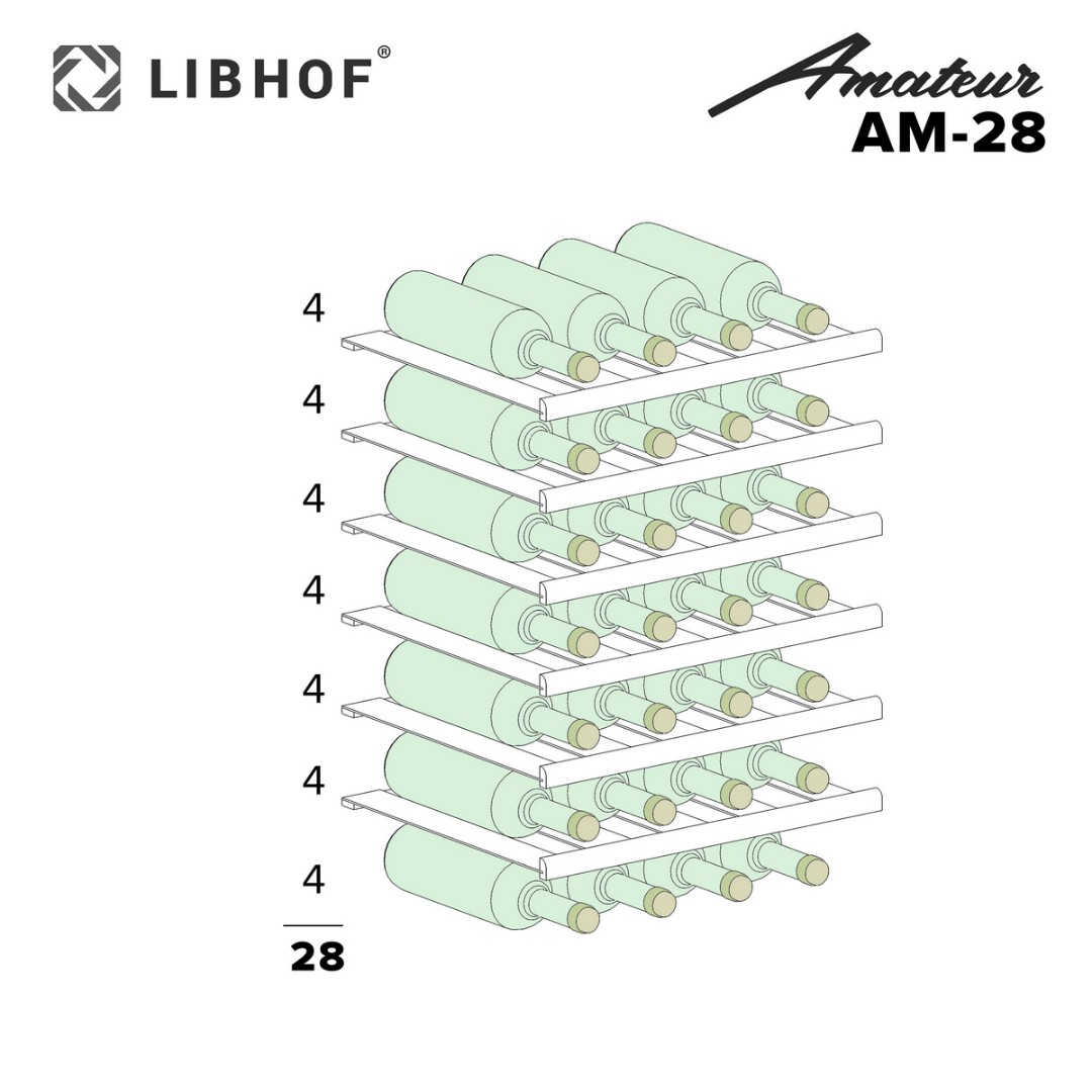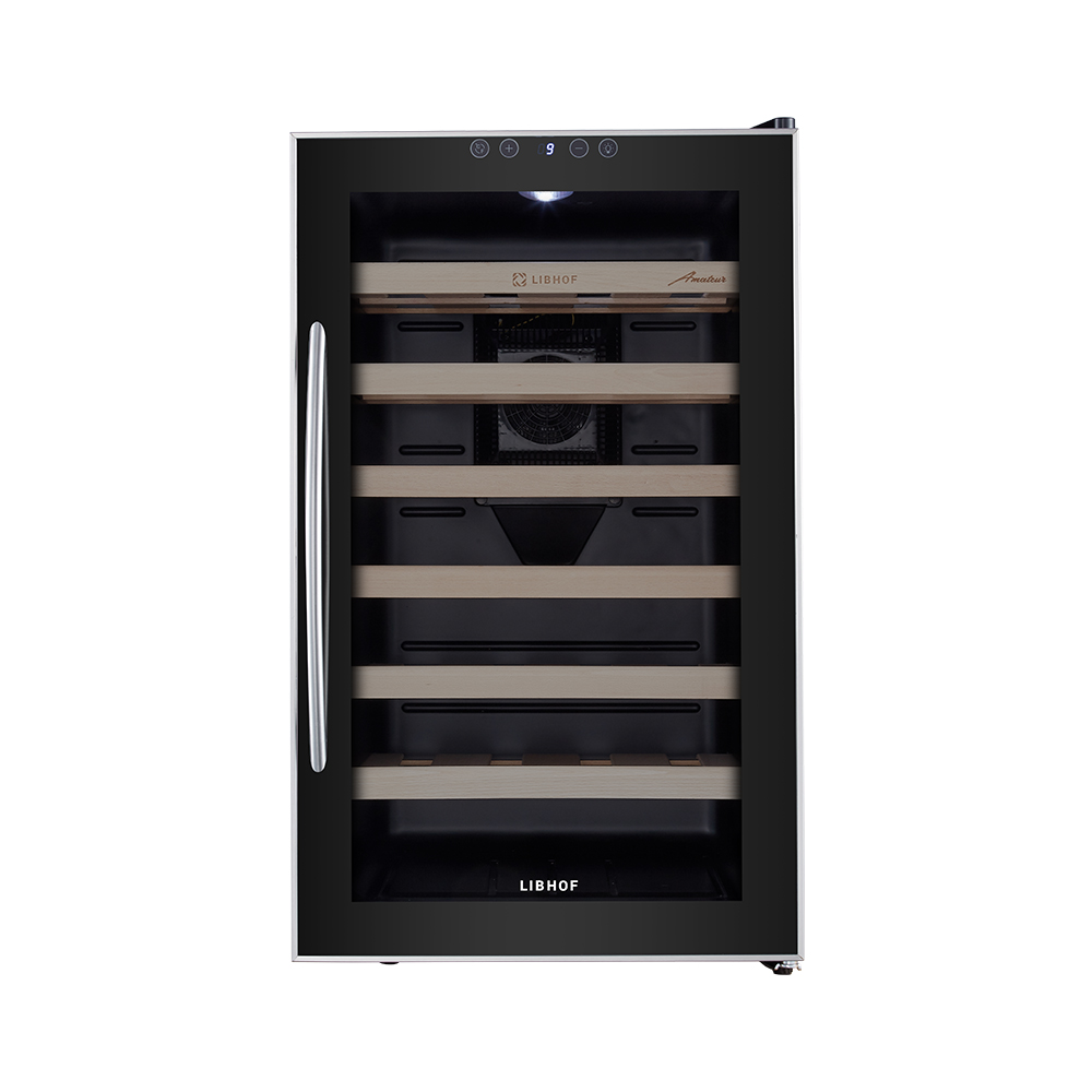 Монотемпературный шкаф Libhof AM-28 отвечает всем требованиям для идеального хранения вина. Термоэлектрическая система охлаждения гарантирует очень низкий уровень шума, равный всего 41 дБ, и практически полное отсутствие вибраций. Чтобы пробки не рассыхались, и в вино не попадал кислород, бутылки кладутся горизонтально на шесть съемных полок из массива бука.